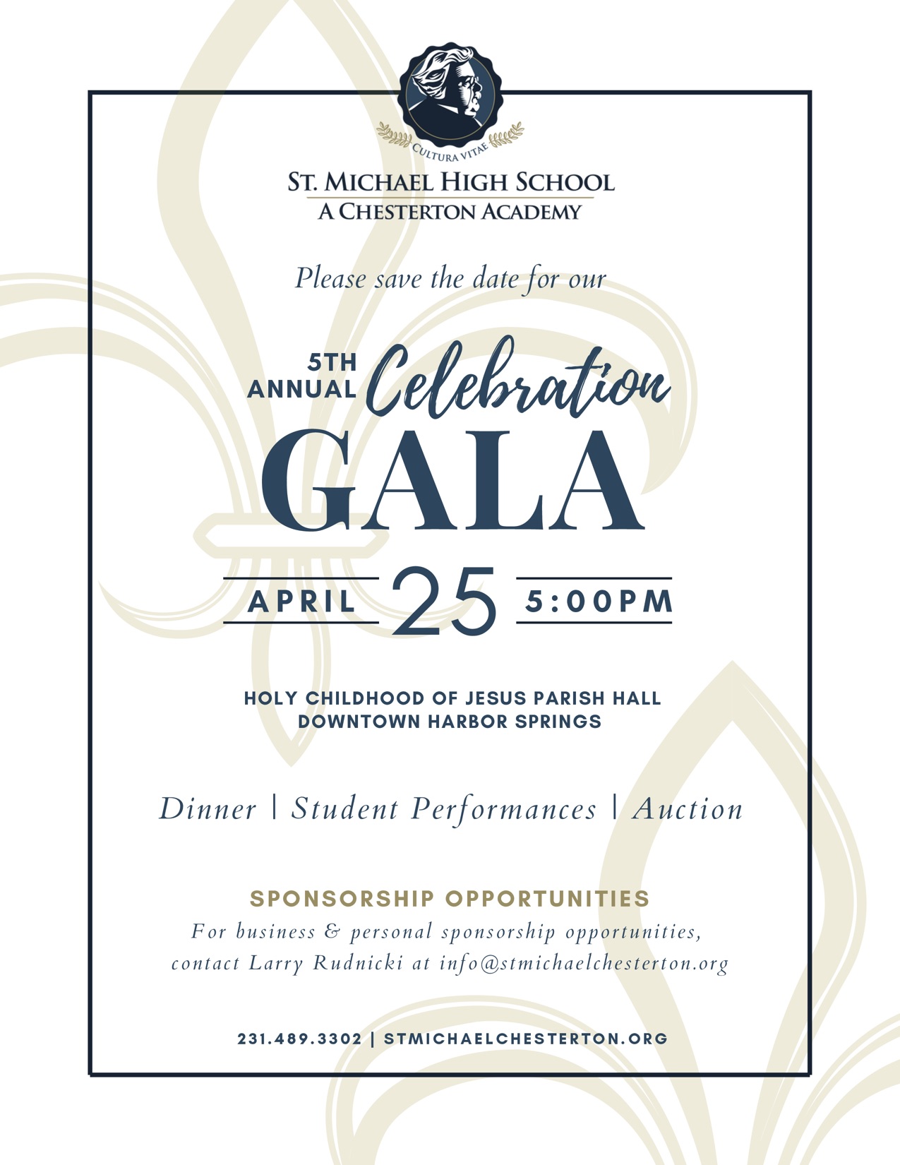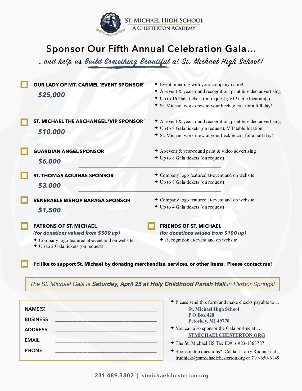 For business & personal sponsorship opportunities, please contact Larry Rudnicki at 719-650-6149 or lrudnicki@stmichaelchesterton.org